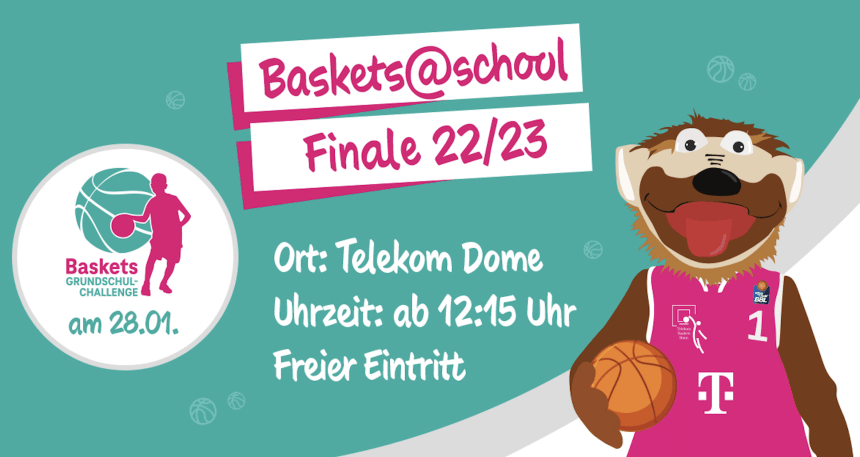 Nach dem erfolgreichen Abschluss der Challenge Days im Ausbildungszentrum (ABZ) der Telekom Baskets Bonn freuen wir uns riesig, die acht Finalschulen dieses Jahr wieder zum großen Baskets Grundschul-Challenge Finale im Telekom Dome in Bonn begrüßen zu dürfen. Beim Finaltag am 28.01, ab 12:15 Uhr, ist für ein buntes Rahmenprogramm gesorgt, sodass ein aufregender Tag in der Halle der Telekom Baskets Bonn garantiert ist.